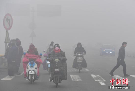 資料圖:河北石家莊民眾“霾頭”出行。 中新社記者 翟羽佳 攝