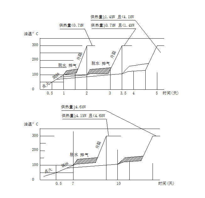 3、鍋爐和管道中聲響變小,循環(huán)油泵不再出現(xiàn)抽空現(xiàn)象,可以5℃/時(shí)的速度再升溫,但不能超過(guò)120℃,直到放空管不再有氣體排出為止。